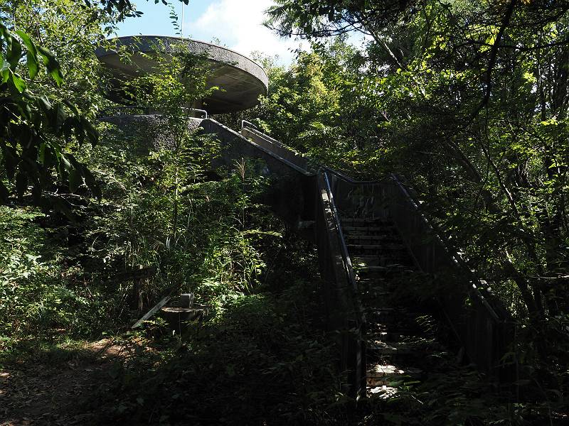 道標から10分弱で何か見えてきた。ホルン五箇山展望台かなと思って向かって行ったらやはりそうだった。どうせ展望なんて無いと思いつつ上ったがやはり無かった。階段のタイルが剥がれており、手入れされなくなってから長いようだ。途中の道標にあったグリーンピアなかがわまで0.3kmと言うのはここまでの距離のようだ。