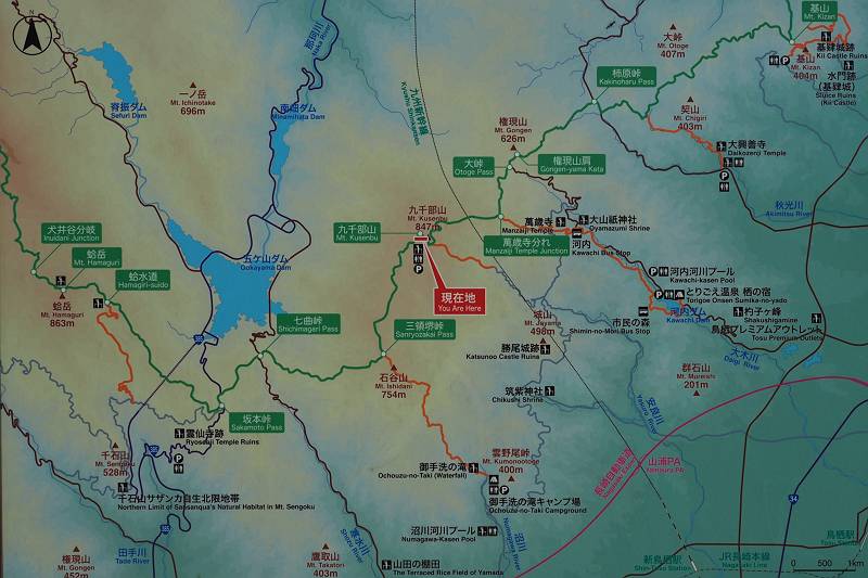 山頂に行くまでに2枚ほどの新しい案内板があった。前に来たときにも2枚あったが片方が字が消えていて全く読めなかった。今回見た九千部山の案内板に書かれていた文章は古い案内板とほぼ同じだが、少し文章が付け足されていた。