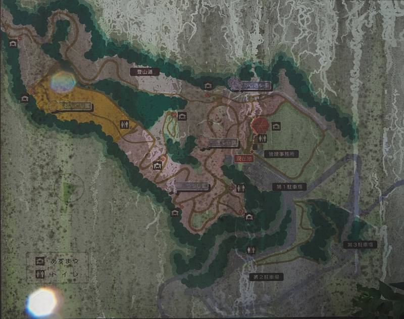 舗装道を下りていくと第一駐車場に出た。スキップ広場というところに下りていけば良いらしいのだが、どう行けば良いのかわからない。園内には案内図の類があるだろうと思っていたけど、第一駐車場まできてやっと案内図があった。でも、この案内図にはスキップ広場は載っていなかった。