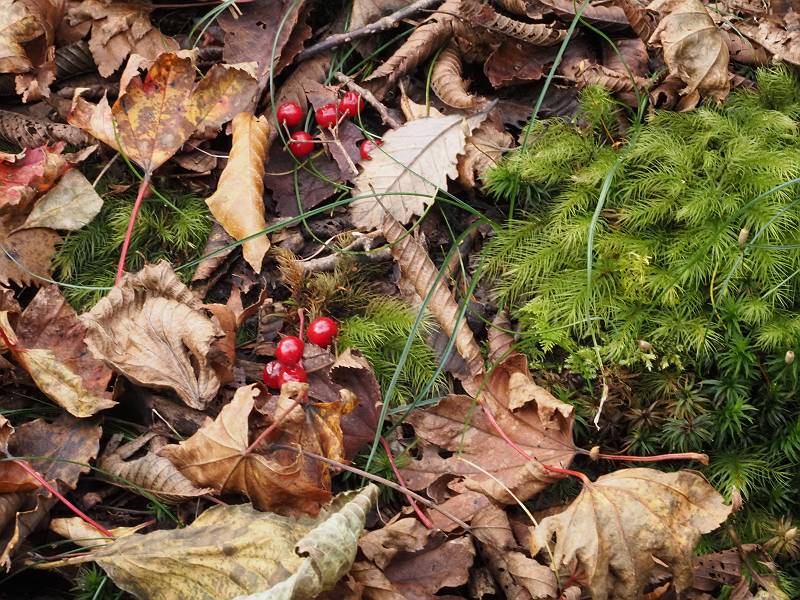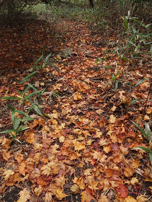 落ち葉に覆われた道を登っていった。踏み跡は落ち葉で見えなくなっているが、赤テープがわりと多く付けられていたので、道はわかりやすかった。足を進める毎に落ち葉の香りが立ち上ってきた。紅葉には少し遅かったが、落ち葉を踏み締め、その香りを嗅げたことで秋らしい山歩きになった。