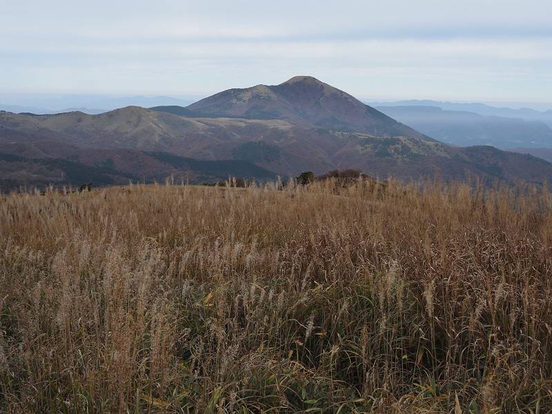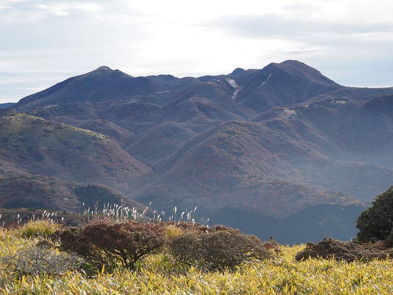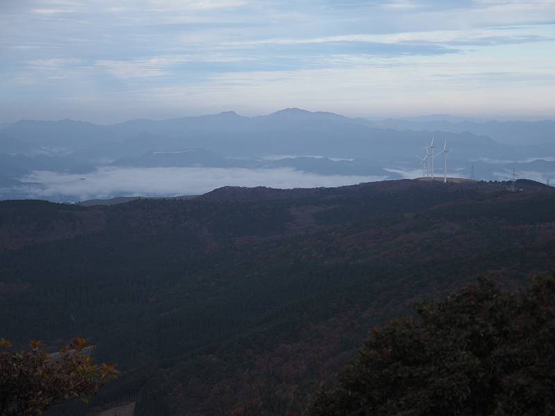 山道を上り出してから20分くらいで津江の山々や涌蓋山が見えてくるようになった。木はまばらになり、草丈が高い道になったが、草に朝露が付いていないがありがたかった。昨日の天気予報で空気が乾燥していると言っていたので、朝露は付いていないだろうとは思っていたが、山の中の事なので、多少は心配していた。天気予報では終日晴れると言っていたが、これは外れだろう。曇っていて、晴れてくる気配は無かった。