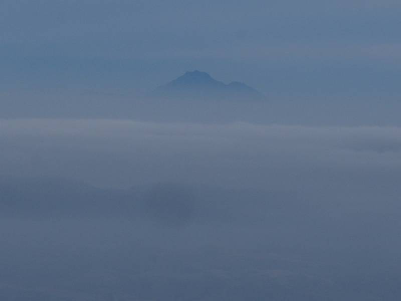 山頂からの雲の中にぽっかりと見える山があった。方向的に鞍岳かなと思ったけど、鞍岳とは形が違っていた。と言うことは雲仙かと思い、とりあえず写真を撮っておいて後で調べることにした。だが、車で帰る途中の県道16号から雲仙が見えたが、その形が遠望所から見えた形と同じだったのでやはり雲仙だったと確認できた。