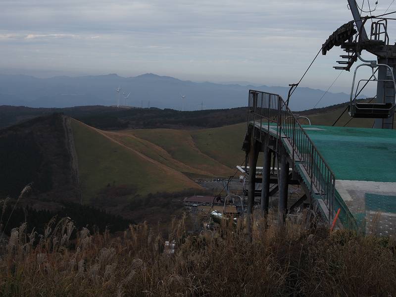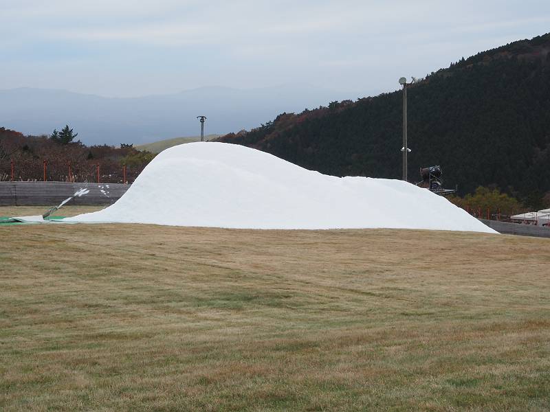 スキー場の下の方では造雪中だった。後で調べたら九重森林公園スキー場のオープンは12/12の予定だそうだ。気温は10度程だったので、溶けて無駄になりそうな気がしたが、どんどん造雪すれば問題はないのだろう。そう言えば、桧枝岐スキー場は雪を夏まで残して、真夏の雪まつりをやっているけど、雪の上にかぶせているシートはそれほど断熱性が高そうにないシートだった。雪の量が多ければ、気温はそれほど問題ないのだろう。