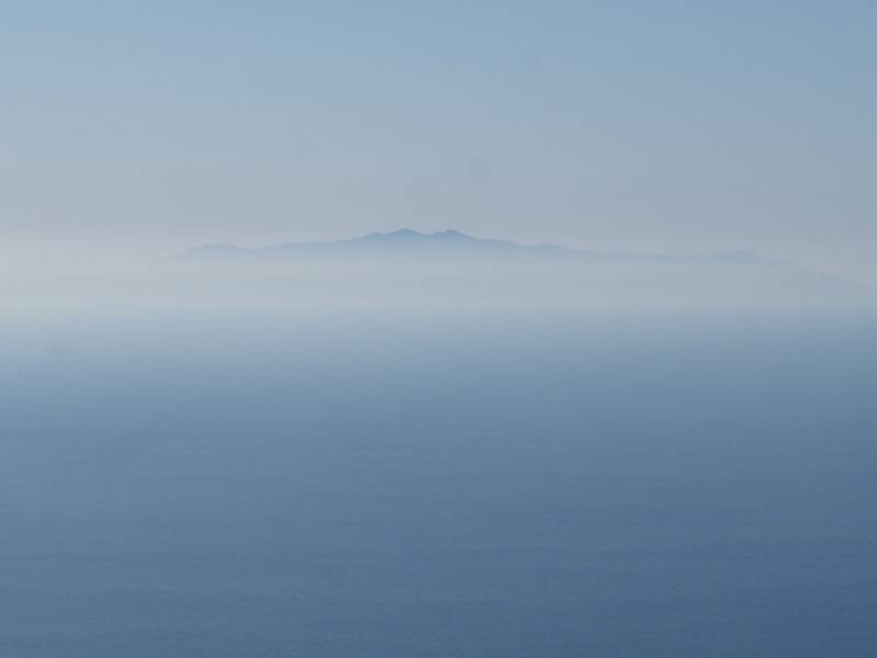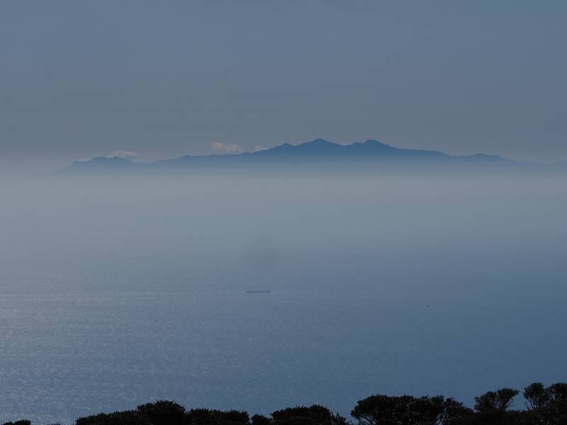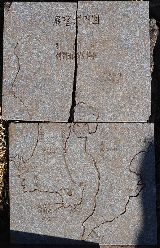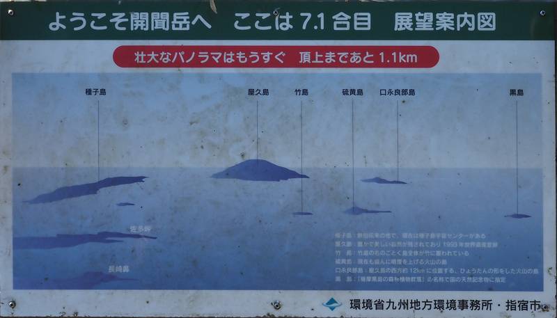 7.1合目に7合目から16分で到着。何かあるから8合目かと思ったけど、7.1合目でぬか喜びさせられた。あったのは展望案内図だった。手前から見えていた島は屋久島だろうと思っていたけど、展望案内図の形と違った。でも、雲の上にてっぺんを出ているような標高の山は屋久島くらいしかないだろうけど、形が違うので???と思っていた。家に帰ってからカシミール3Dで調べれば屋久島かどうかは判明すると思ったのでそれ以上は考えなかった。カシミール3Dで調べた結果はやはり屋久島だった。展望案内図がちょっと残念なもので描かれているのは鳥瞰図のため、実際の景色とは異なると言うのが結論となった。