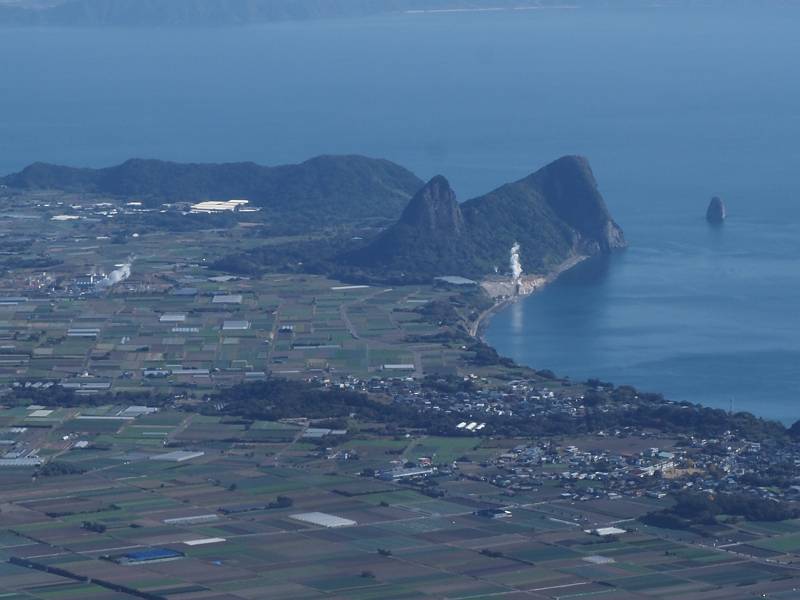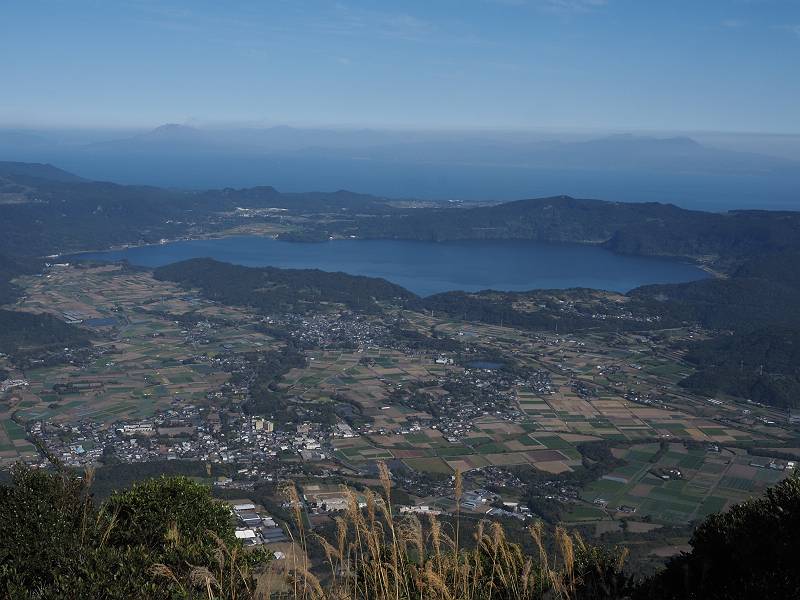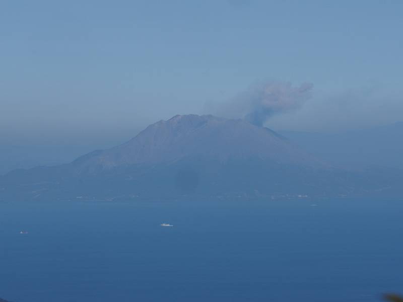 5合目にはベンチはあったが使用禁止になっていた。展望所になっており、池田湖、長崎鼻、佐多岬が見えた。池田湖を見ていたら、視界の端に何かが見えたので良く見ると桜島の噴煙だった。わずかに身を乗り出すと桜島が見えた。