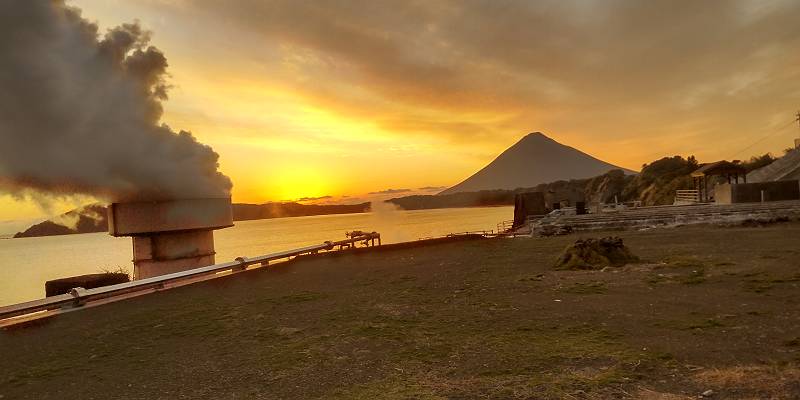 たまて箱温泉から海に近い方へ行けて、そちらからは開聞岳がきれいに見えそうなので行ってみた。開聞岳から蒸気が上がっているのが見えたが、これは山川製塩工場跡から上がっている蒸気だった。